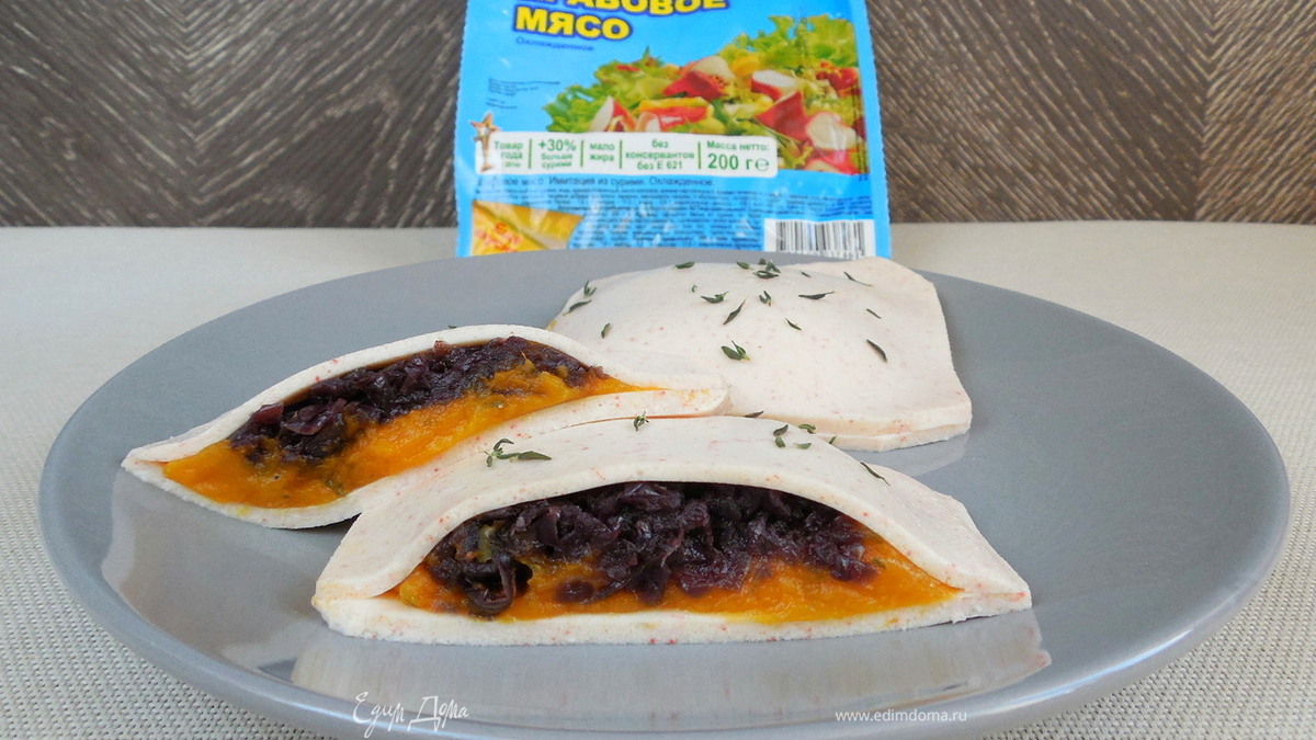 Только эти равиоли не из теста, а из тонких листов сливочного желе с крабовым мясом VICI! Кремовая тыквенная начинка с тимьяном и карамелизированным красным луком гармонично сочетается с крабово-сливочным «тестом», создавая удивительный вкус этой необычной закуски!