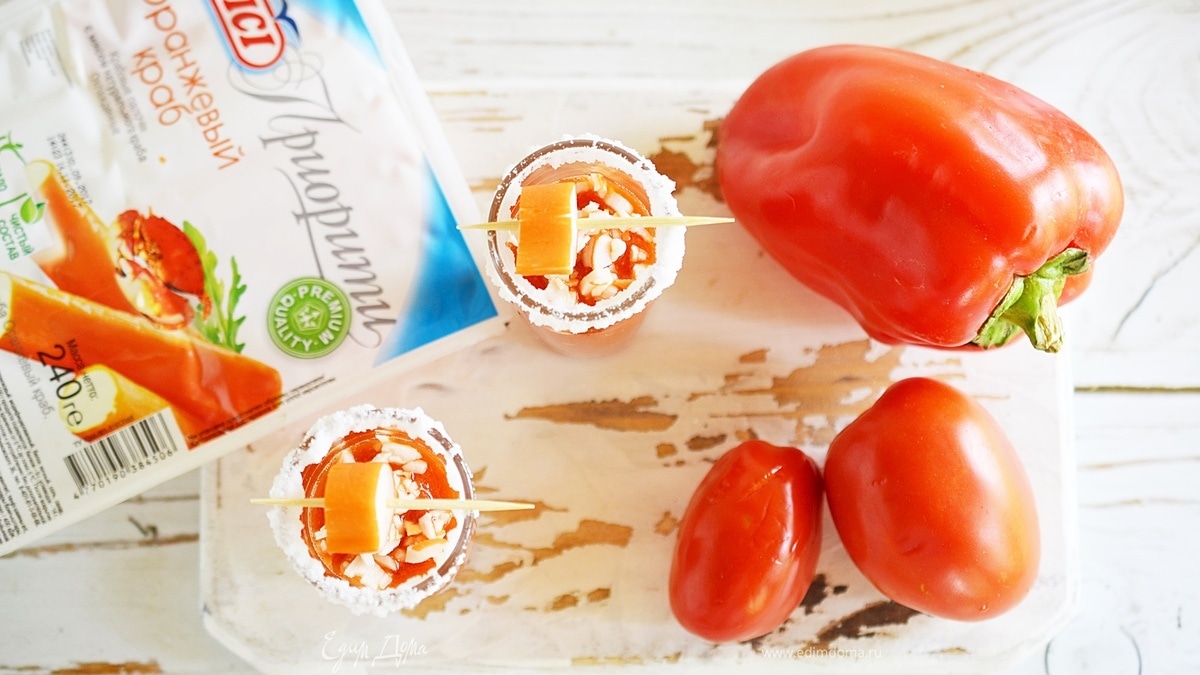 Интересная оригинальная закуска, которая отлично подойдет к крепким спиртным напиткам. Порционная подача и пикантный вкус делают ее незаменимой для фуршета или просто для большой компании. Маленькие рюмочки наполнены овощным соком и украшены крабовыми палочками! Приготовить просто, а съесть очень вкусно!