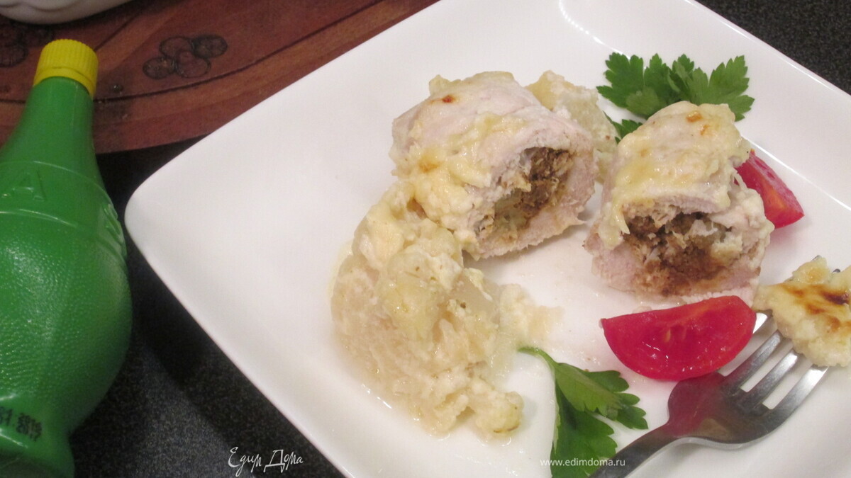 Подаем куриные рулетики с начинкой из печени и яблок, добавляем запеченные овощи под соусом бешамешь. Приятного аппетита!