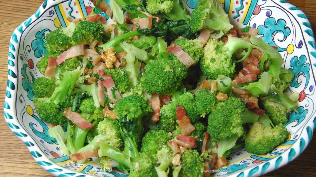 Мне кажется, это полезный, здоровый и вкусный гарнир, но он обязательно должен быть горячим: если будете подавать его на следующий день, добавьте в сковороду немного воды и прогрейте под крышкой или разогрейте в микроволновке или духовке — как вам больше нравится! Всю воду удалить из брокколи трудно, поэтому выкладывайте ее только на холодную сковороду, иначе начнется стрельба. Сало лучше использовать домашнее, вместо грецких орехов можно взять кедровые, а вместо кинзы — базилик или петрушку, а вот укроп сюда не подойдет.