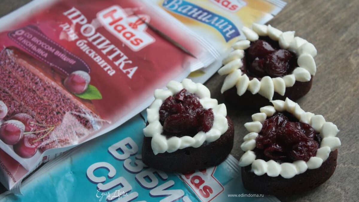 Следуя инструкции, приготовьте вишневую пропитку ТМ Haas и щедро пропитайте ей пирожные (я просто окунаю их в пропитку на мгновение, а затем слегка прохожусь кисточкой). Если у вас формочки без отверстий, тогда разрежьте пирожные напополам и каждую часть пропитайте получившимся вишневым сиропом-пропиткой. - Шаг 6