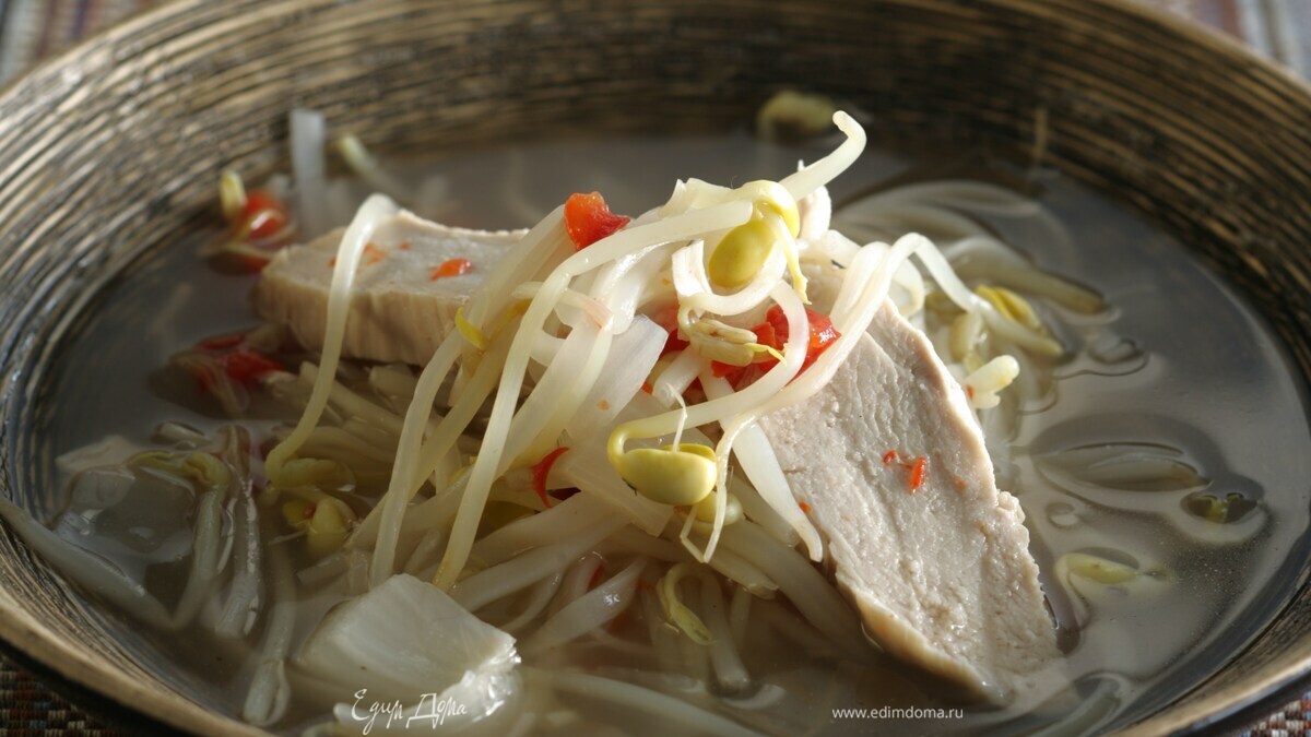 - Шаг 7Вернуть в суп куриное мясо, добавить лук, перец, кинзу и ростки сои. Все перемешать и слегка подогреть.