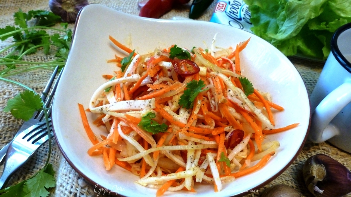 Острые салаты в моей семье любят, и поэтому готовлю я их довольно часто. Рецепт со временем выработался под себя, возможно, с отклонениями от классики, но под вкусы домашних.