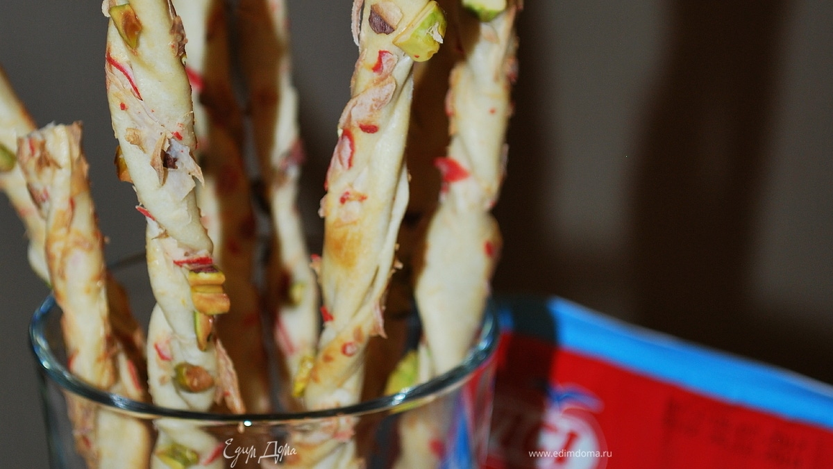 Хрустящие палочки с фисташками, попкорном и крабовыми палочками.