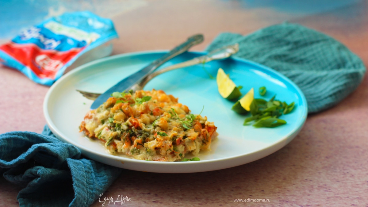 Смешать маскарпоне со всеми ингредиентами для «шубы», включая крабовые палочки с креветками. Противень выстелить фольгой, разложить лосось кожей вниз на противне, равномерно выложить «шубу» на все порции рыбы. - Шаг 3