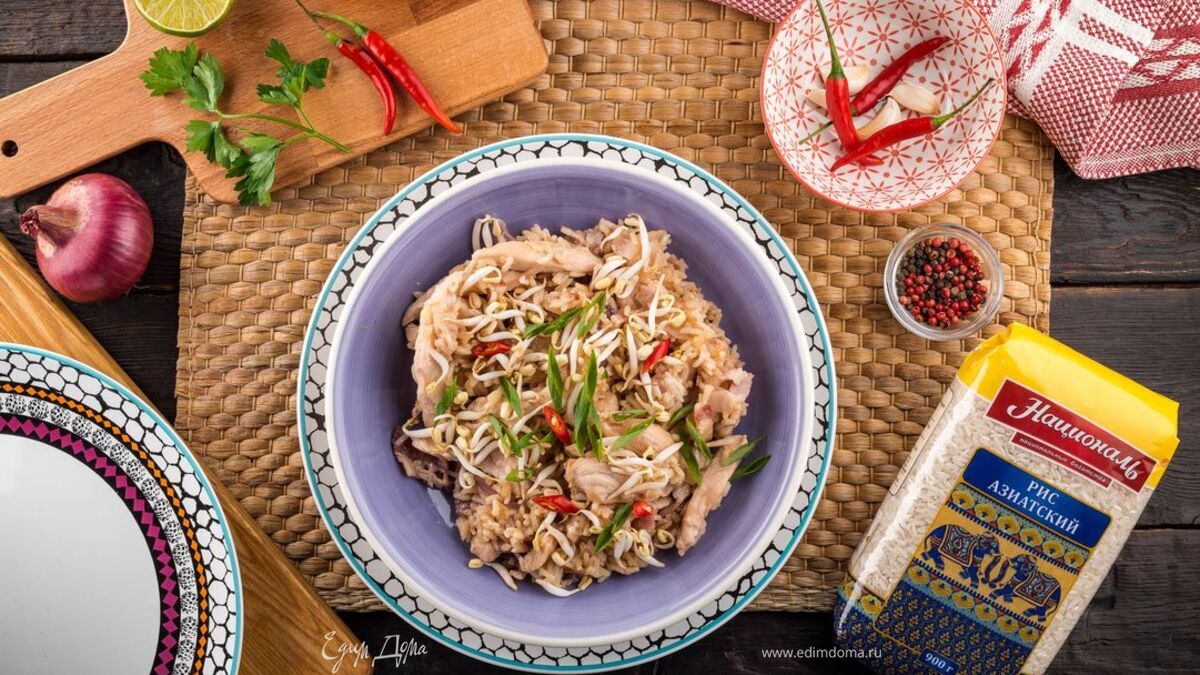 Готовое блюдо посыпьте блюдо перьями зеленого лука и перца чили, а сверху добавьте соевые ростки. Пикантное блюдо готово. Приятного аппетита!