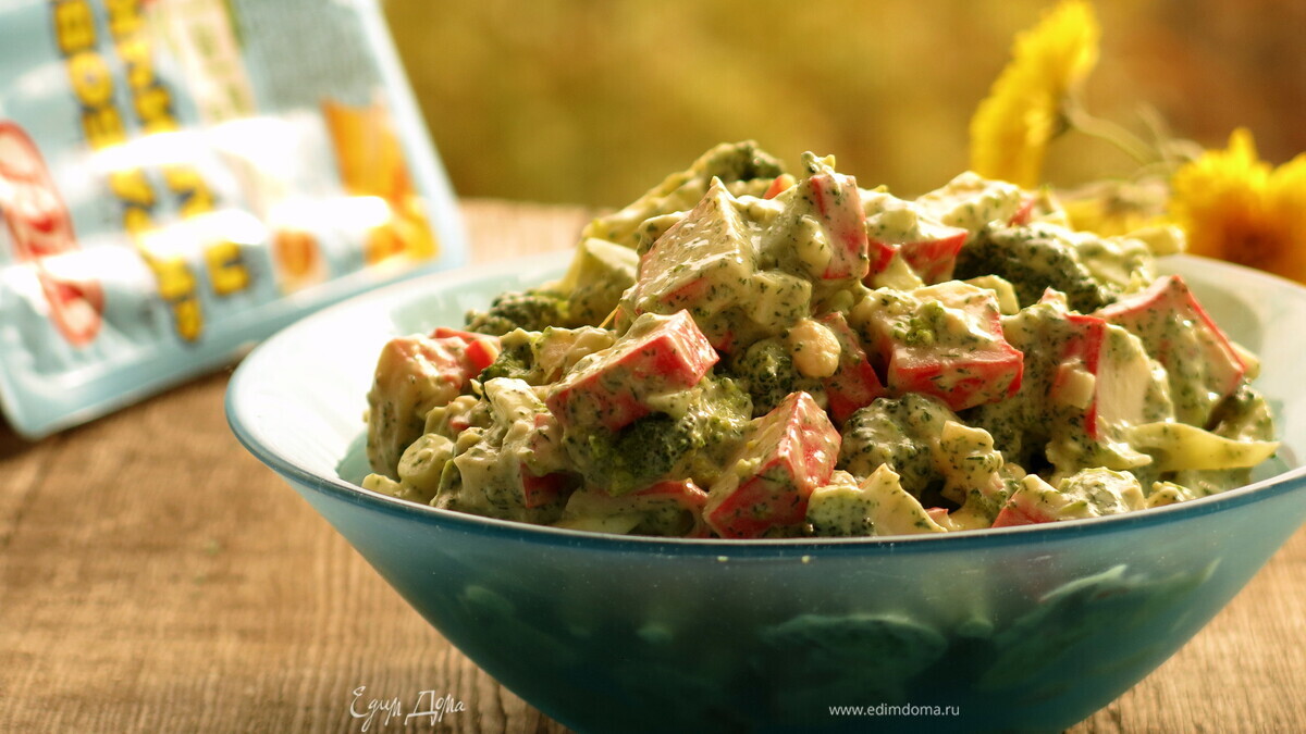 Салат с крабовыми палочками и брокколи — легкая закуска с интересной заправкой. Соус из йогурта с перемолотой семгой и зеленью укропа. Нарезка крупная, соус дополняет брокколи и палочки, не заглушает их вкус. А укроп в йогурте добавляет свежести, витаминов и, конечно, цвета. Приятного!