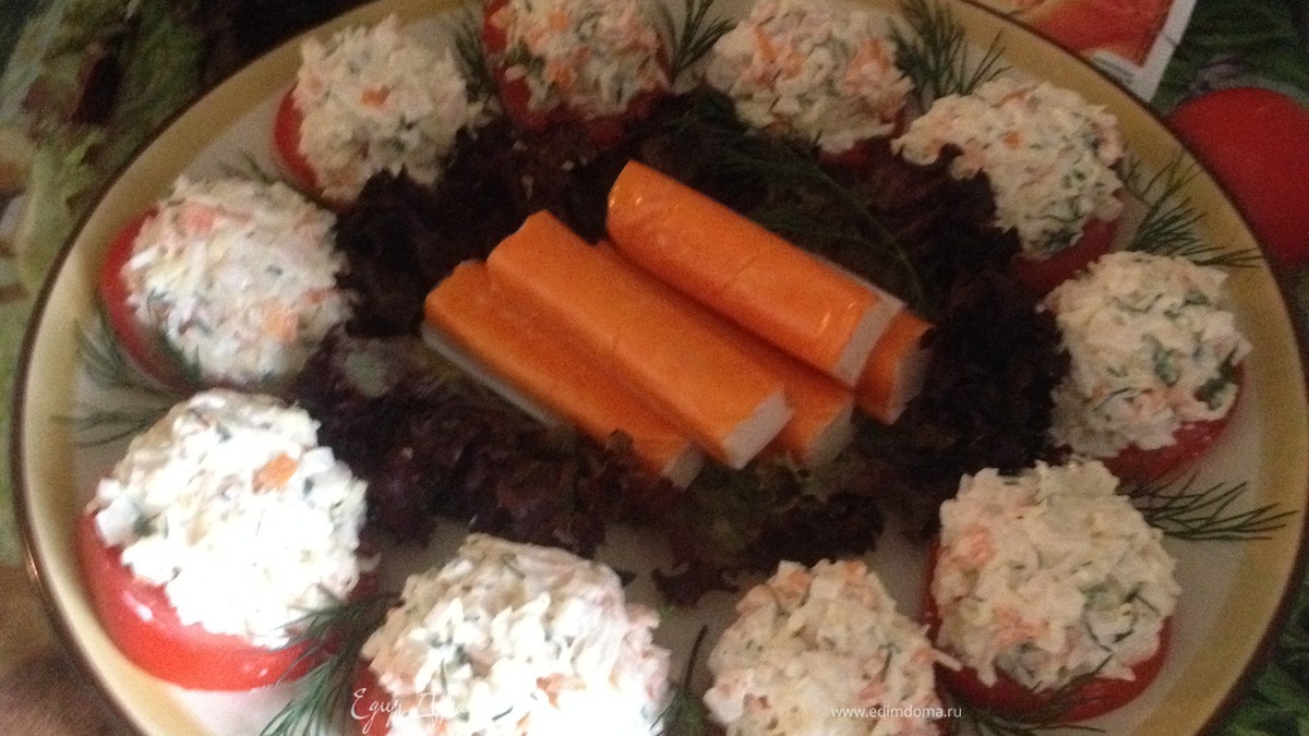 Помидоры выложить на блюдо и по столовой ложке салата. Красиво оформить зеленью как вам нравится.