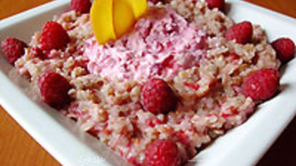 - ПодготовкаК 100 г малины добавить сыр, немного сахара и хорошо размешать. Получившуюся массу поставить в холодильник. В сотейнике вскипятить воду с сахаром, добавить сливочное масло и хлопья. Варить, постоянно помешивая, 2-3 минуты. Добавить молоко и варить еще пару минут. В готовую кашу добавить оставшиеся ягоды малины (немного оставить для украшения) и хорошо перемешать. В тарелку при помощи формы выложить малиновый мусс. Не убирая формы, вокруг нее выложить кашу. Подать кашу, украсив её ягодами малины и дольками персика.
