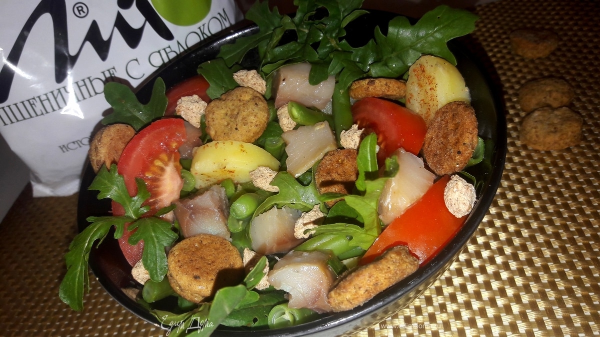 Салат с картофелем, скумбрией и крекерами из отрубей