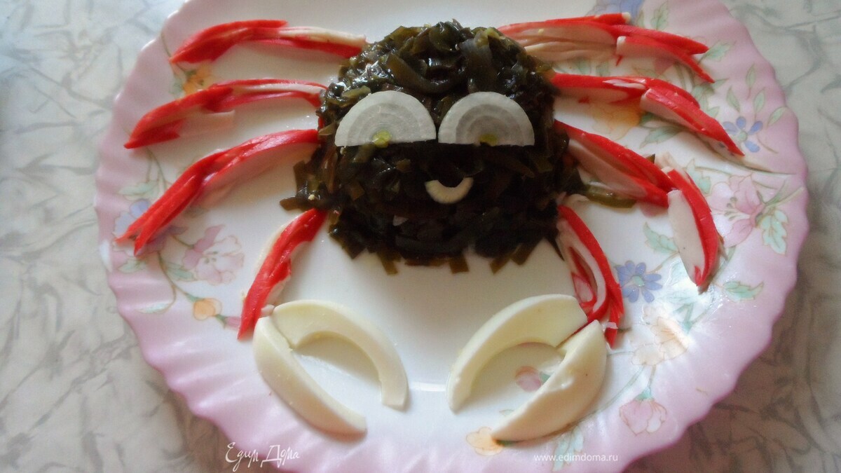 Вырезать из яиц клешни, выложить. Сделать глазки и ротик из лука. Готово! приятного и веселого аппетита!