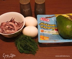 Подготовим продукты, отвариваем яйца, кальмары — в кипящей воде 2 минуты.