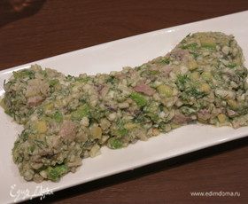 Традиционное время салатов — новогодние праздники. И салаты с крабовыми палочками — вторые по популярности после оливье, если, конечно, и оливье не нестандартный, с крабовыми палочками. 2018-й — год Собаки по восточному календарю. Салат тематический — «Косточка». Состав без мяса, не собачий, хотя мой младший пес очень любил рыбу (как и все другое), и в шутку мы его называли «котярой». Крабовые палочки и внутри, и декор, и защита от обветривания продуктов. Менее кровожадные косточки получаются, если использовать только белую часть. Такой салат можно приготовить и на Хеллоуин, тематика позволяет. Приятного!