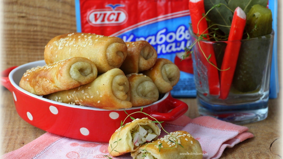 Необыкновенно нежные, слоистые пирожки с начинкой из соленых огурцов с сочными крабовыми палочками ТМ «VICI» создадут неизгладимое впечатление у Ваших родных.