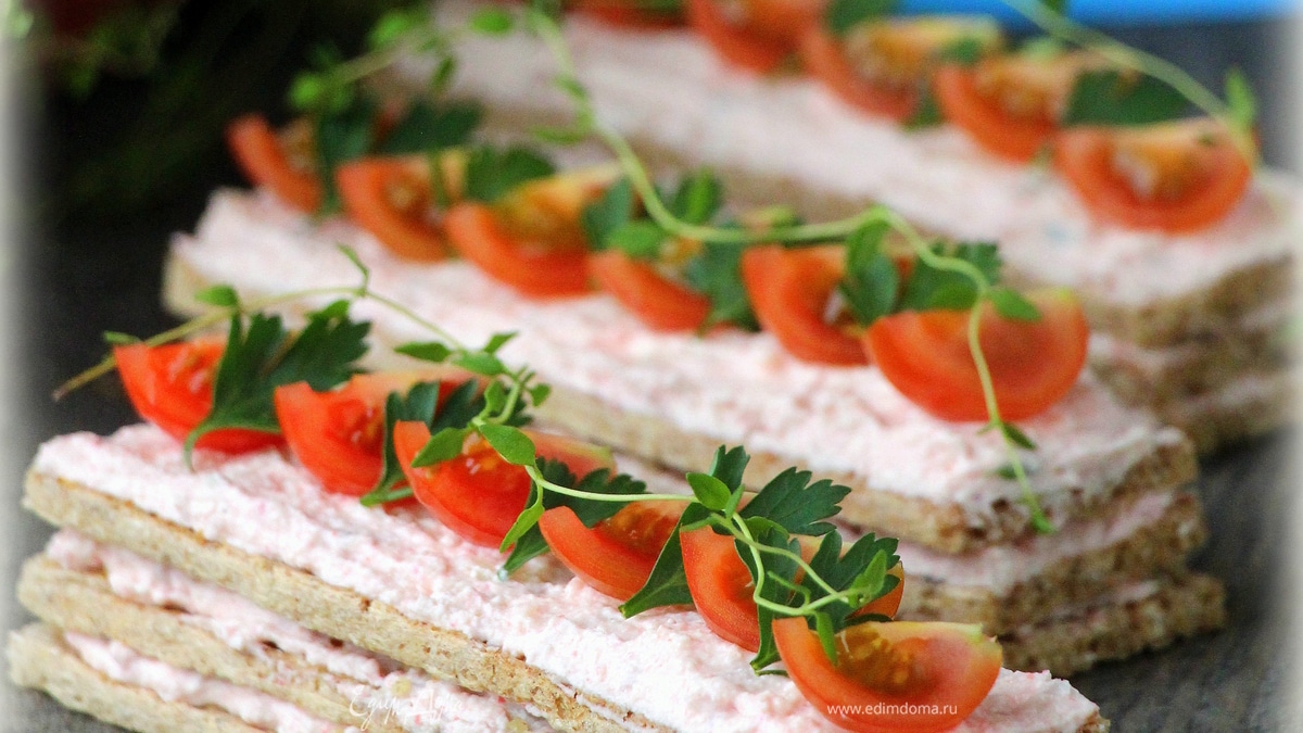 Прекрасная закуска из крабового паштета на хрустящих хлебцах.
