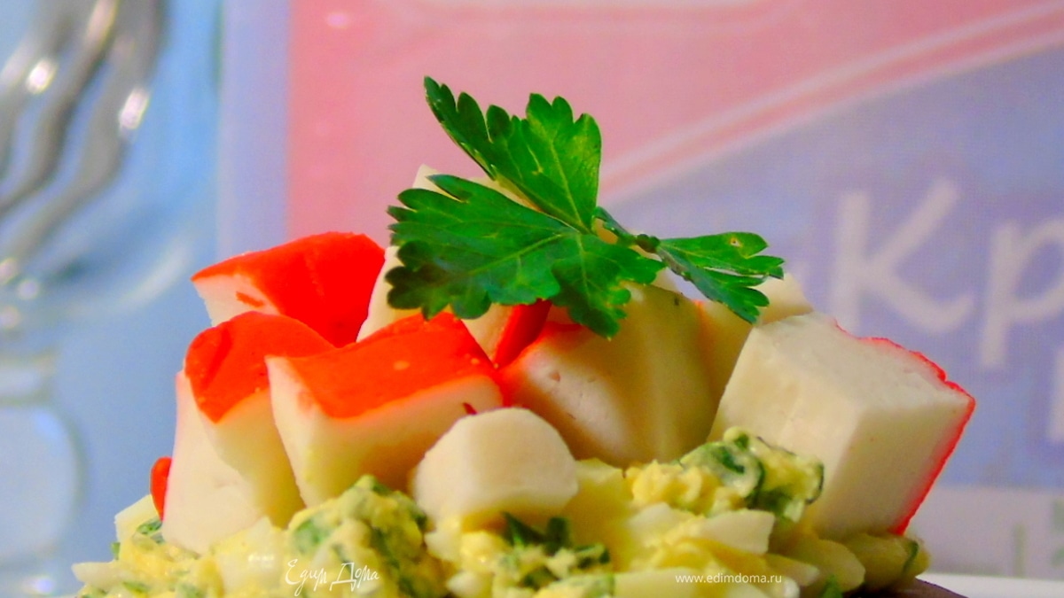 Намазываем на хлеб (крекер, брускетту), сверху украшаем кубиками крабовых палочек.
