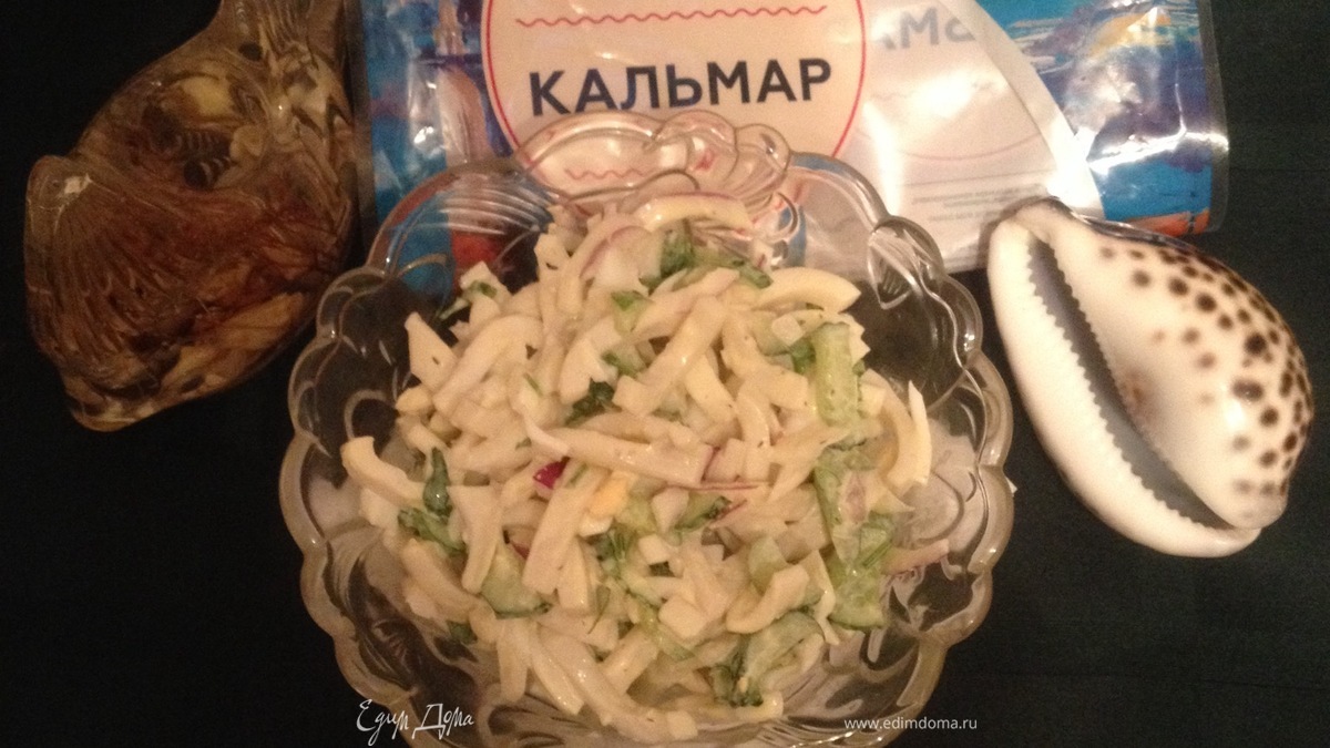 Кальмары прекрасно подходят для ежедного рациона, так как имеют питательную ценность и полезные вещества. И пользуются популярностью в русской кухне. Простой и незатейливый салатик не доставит много хлопот.
