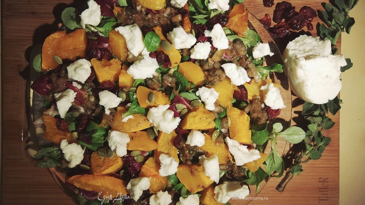 В большую салатницу выкладываем смесь салатов (руккола, корн, латук и т.п. — по вашему вкусу), добавляем клюкву и семечки, тыкву, поливаем заправкой, сверху украшаем сыром.