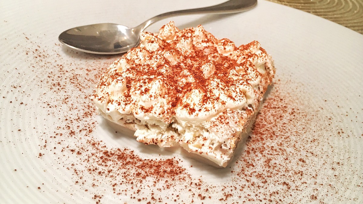 Перед подачей разрежьте тирамису на порционные куски. Оставшийся крем переместите в кондитерский мешок и сделайте кремовые пики на десерте. - Шаг 15