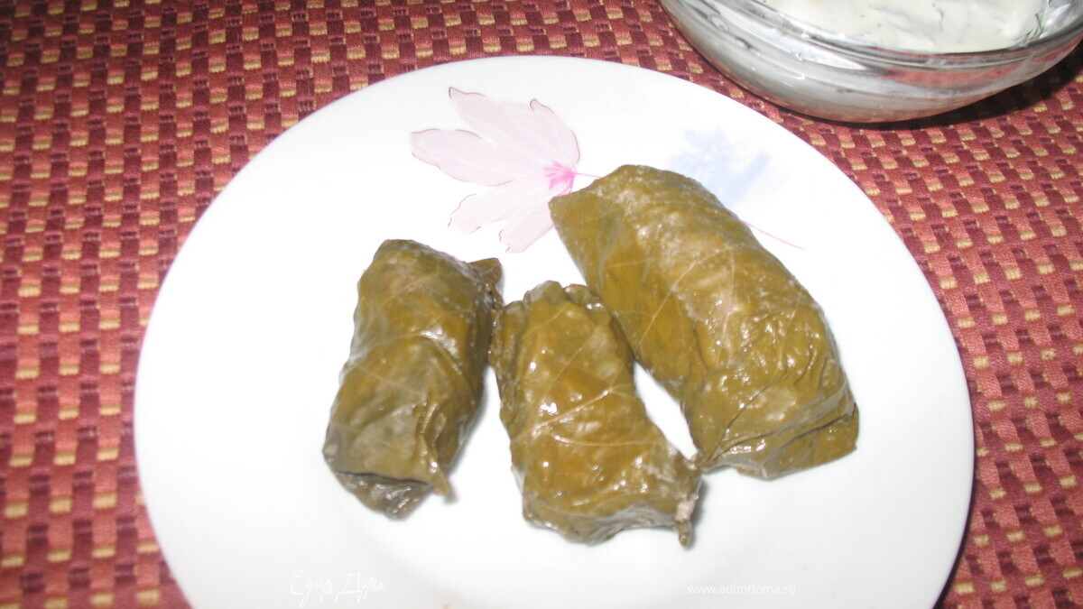 - Шаг 1Листья винограда вымыть, залить крутым кипятком, оставить на 3 мин. Рис промыть и залить кипятком, пусть разбухает, пока вода не остынет. Воду слить, рис выложить в миску, добавить фарш, порезанный кубиками лук, помидор (помидор предварительно обдать кипятком и снять кожицу), рубленную зелень, порезанный мелко зубчик чеснока, присолить, приправить. Обрезать стебельки от листиков. Завернуть начинку в виноградный листок, сложить в кастрюльку, такую, чтобы можно было поставить в духовку. Я тушу в глиняном горшке. Накрыть долму плоской тарелкой и влить бульон так, чтобы края тарелки были в жидкости. Закрыть крышкой и поставить в духовку для тушения на 200 градусов, а через 30 мин убавить температуру до 160 градусов и тушить пока вся жидкость не впитается. Подавать с соусом: в домашнее жирное кислое молоко (можно сметану) выдавить зубчик чеснока и добавить порубленный пучок зелени (кинза, мята, петрушка, укроп).