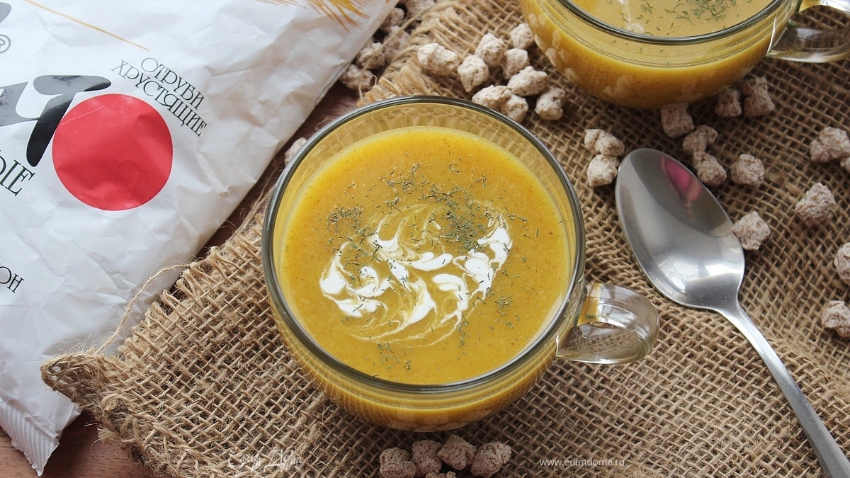 Готовится быстро и просто, получается вкусно, полезно и ароматно. Здесь нет сливок и картофеля, что так привычны для приготовления супа-пюре. Тем не менее, этот яркий овощной красавец разнообразит обеденное меню. Особый пряный аромат и вкус придают специи, а добавление отрубей максимально увеличивает его полезность.