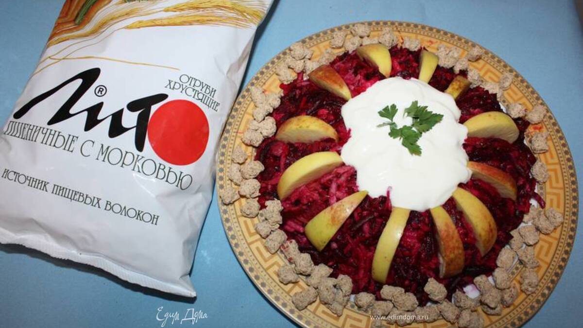 Добавить 25 г хрустящих отрубей ТМ «Лито». Обратите внимание, что добавлять отруби следуем перед самой подачей на стол. Если вы планируете подать салат позже, то все отруби (50 г) следует уложить вокруг салата в конце (см. фото ниже). - Шаг 7