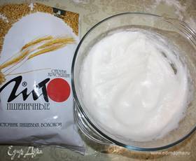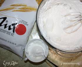 Далее взбить в густую пену (на максимальной скорости миксера). Затем начать вводить оставшийся сахар маленькими порциями (по 1 ч. л.) при непрерывном взбивании.