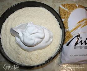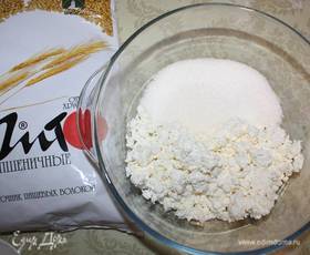 Творог смешать с ¾ стакана сахара. Тщательно перемешать.