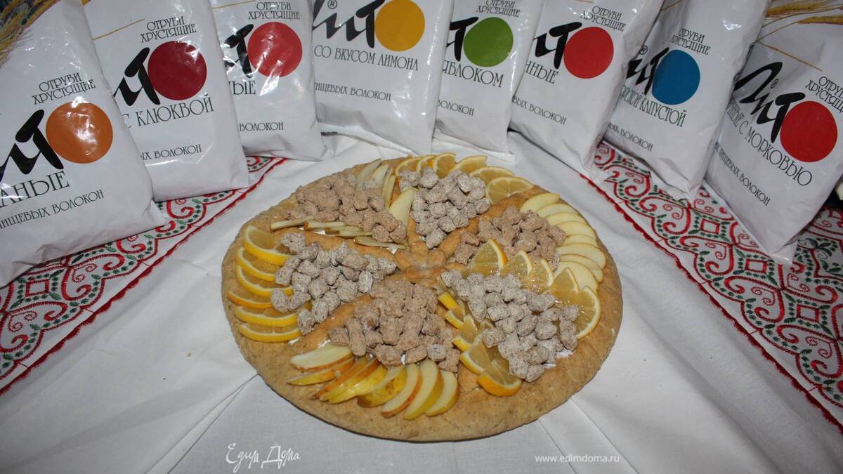 Тесто через 40-50 минут должно увеличиться в объеме. Тесто следует аккуратно выложить на присыпанный мукой стол. Раскатываем пласт толщиной 0,5 см. Вырезаем круг. Выкладываем в форму, выстланную пергаментной бумагой. С помощью теста украшаем «тарелочку». Края защепляем. Затем накройте и дайте время на расстойку (около 40 минут). Тесто должно увеличиться в объеме. После этого пеките примерно 35-45 минут в духовке, которую необходимо нагреть до 200-220°С. Вынимаем из духовки, даем время остыть. Далее сервируем фрукты/овощи и хрустящие отруби.