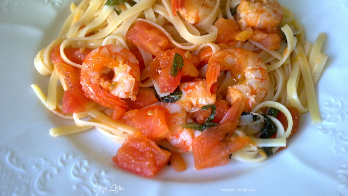 - Шаг 11.В кипящую подсоленную воду кладем лингвини и варим по инструкции. 2.Очистить креветки, удалить кишечники. Головы сохранить. 3.В разогретую сковороду налить оливковое масло, положить разрезанные пополам зубчики чеснока и очищенный от семян перчик чили. Когда они обжариться – вытащить и выкинуть. 4. Помидоры бланшировать, очистить от кожицы и нарезать кубиками. 5. В этом масле обжарить головы креветок, придавливая их вилкой, чтобы вышел сок. Добавить половину помидор, немного воды и тушить потушить минуты 7-10. Аккуратно процедить получившийся соус. 6.Очищенные креветки быстро обжарить на сковороде, вылить обратно на сковороду соус и добавить вторую половину помидор, посолить. Тушить минут 3-7. Добавить мелко порубленные листика базилика или петрушки. 7.В готовый соус добавить готовые лингвини и хорошо перемешать прямо в сковороде. Разложить по тарелкам и при желании прямо в тарелке сверху полить оливковым маслом.