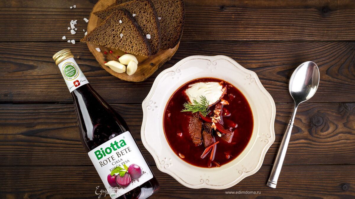 Подавайте борщ со сметаной, свежей зеленью и чесноком. Приятного аппетита!