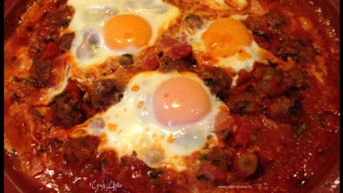 - Шаг 6Разбить яйца, сохранив желток, поверх соуса. Накрыть крышкой и тушить недолго, пока белок не схватится, а желток останется жидким.