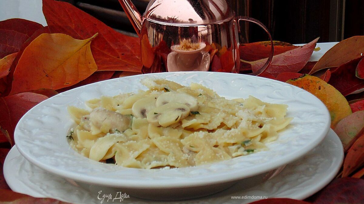 Паста с шампиньонами и луком-пореем
