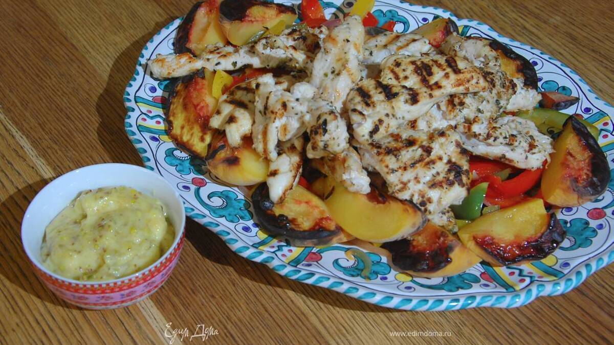Куриные грудки с персиками и фисташковым майонезом