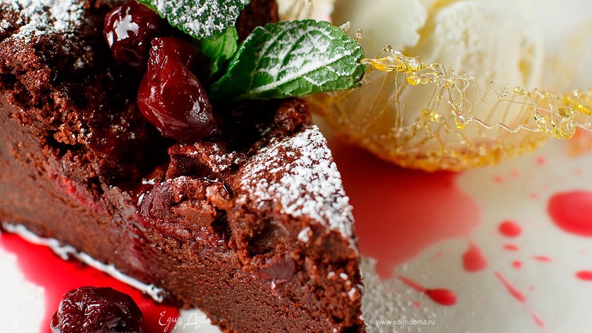 - Шаг 10Остывший брауни посыпьте сахарной пудрой. Украсьте вишнями, мятой. Подавайте с шариком сливочного мороженого.