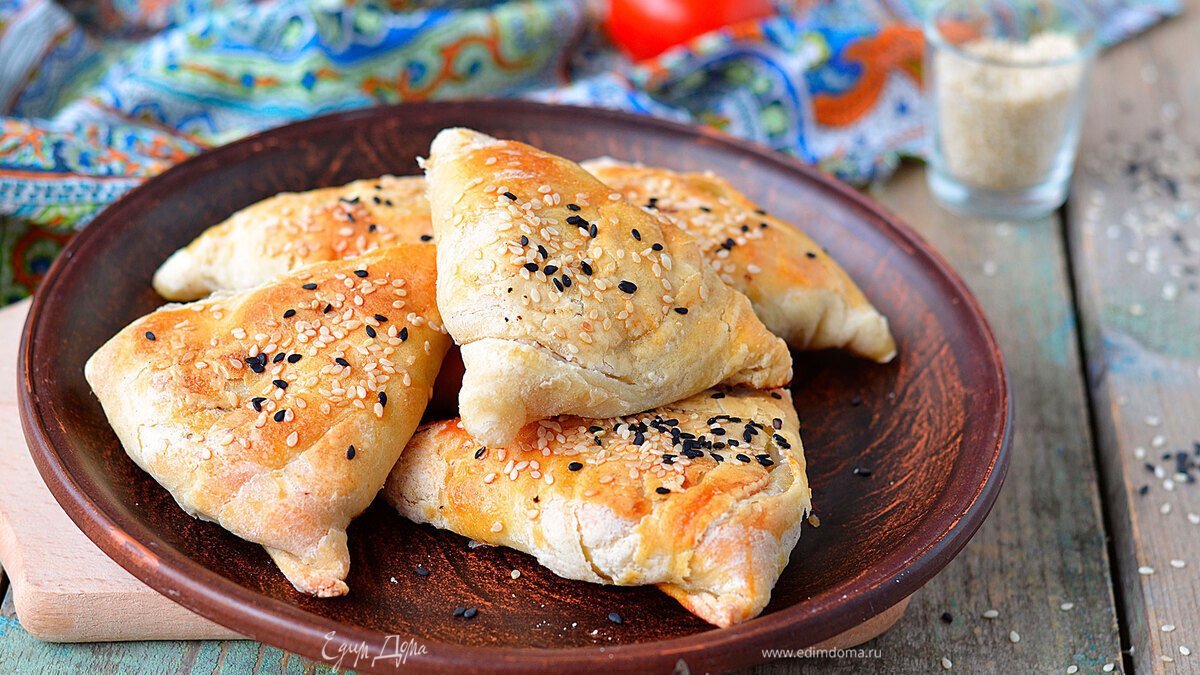 - Шаг 5Раскатайте из теста лепешки диаметром 10-12 см. Выложите на каждую по 1-2 ст. л. начинки и закрепите края, чтобы получился треугольник.