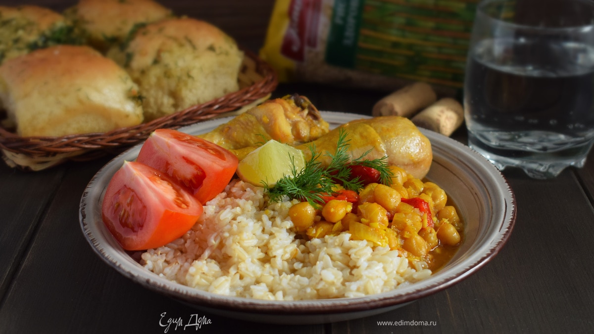 По сути это блюдо состоит из трех простых составляющих: курица, рис и овощное карри. И все вместе — это необыкновенно вкусно и сытно. Для экономии времени я взяла готовый консервированный нут, но можно и приготовить его самим. Перец чили добавляйте по своему желанию.