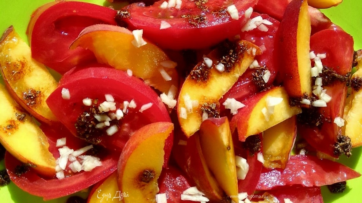 - Шаг 1Тут все просто, помидор и персик режем дольками, поверх мелко порезанный чеснок.