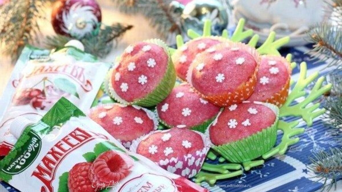 Предлагаю вам вкусные, мягкие, уютные кексы к Новогоднему столу. Кексы с ароматом ванили и малины. А внутри — малиновый джем ТМ «МахеевЪ». Очень вкусно! Подкупает простота приготовления и минимальное количество доступных ингредиентов.