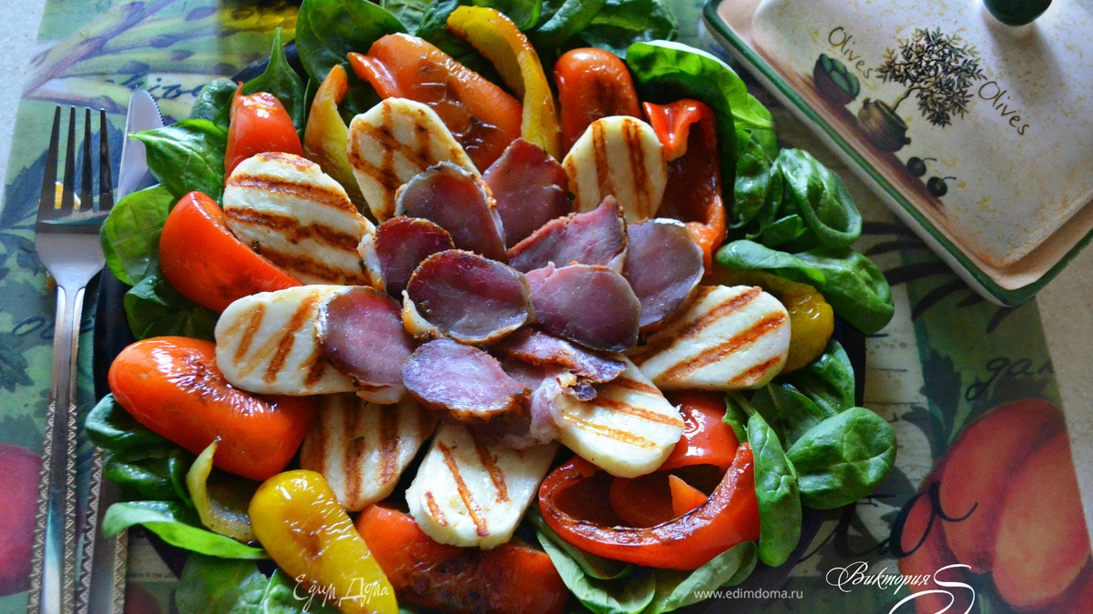 В этой закуске очень гармонично сочетаются вкус свежего шпината, жаренного на гриле перца, сыра халуми и вяленого мяса. Оливковое масло прекрасно дополнило и объединило вкусы в единый гастрономический букет! Очень рекомендую вам приготовить для романтического ужина под бокал вина!