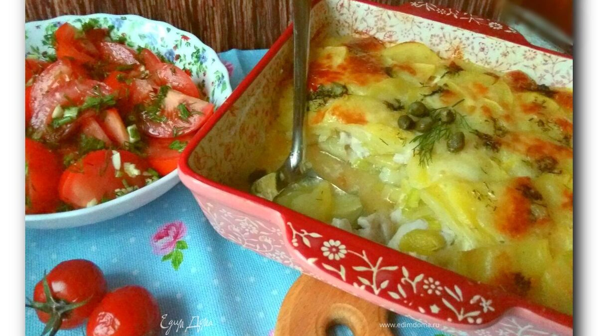 Попросту говоря, это слоеная запеканка из картофеля, лука-порея и мяса курицы, посыпанная сыром. Простое в приготовлении блюдо. Подать можно, как вариант, с салатом из помидоров с чесноком и кукурузным маслом. Чем тоньше вы нарежете картофель, тем нежнее будет запеканка. Мясо курицы можно смело заменить мясом индейки.
