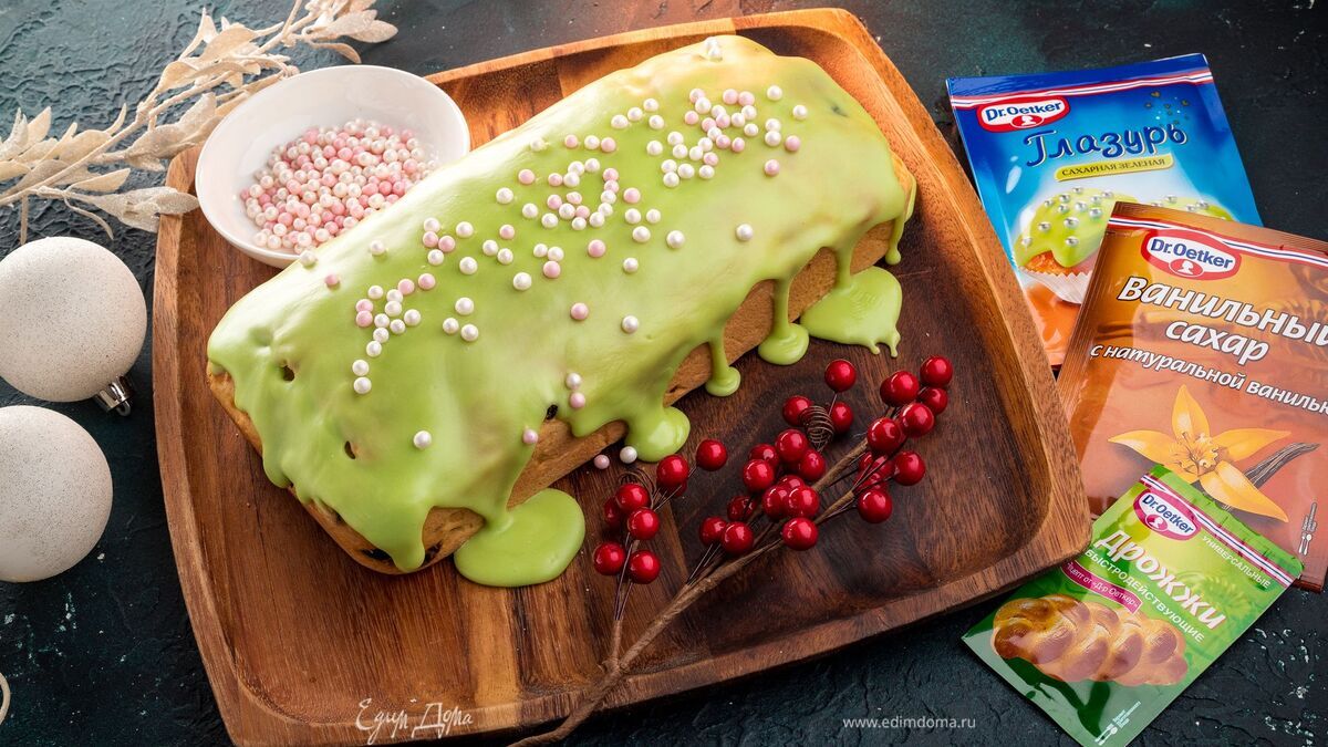 Сразу же, пока глазурь не застыла, украсьте праздничный кекс цветной посыпкой «Жемчужинки» Dr. Oetker.