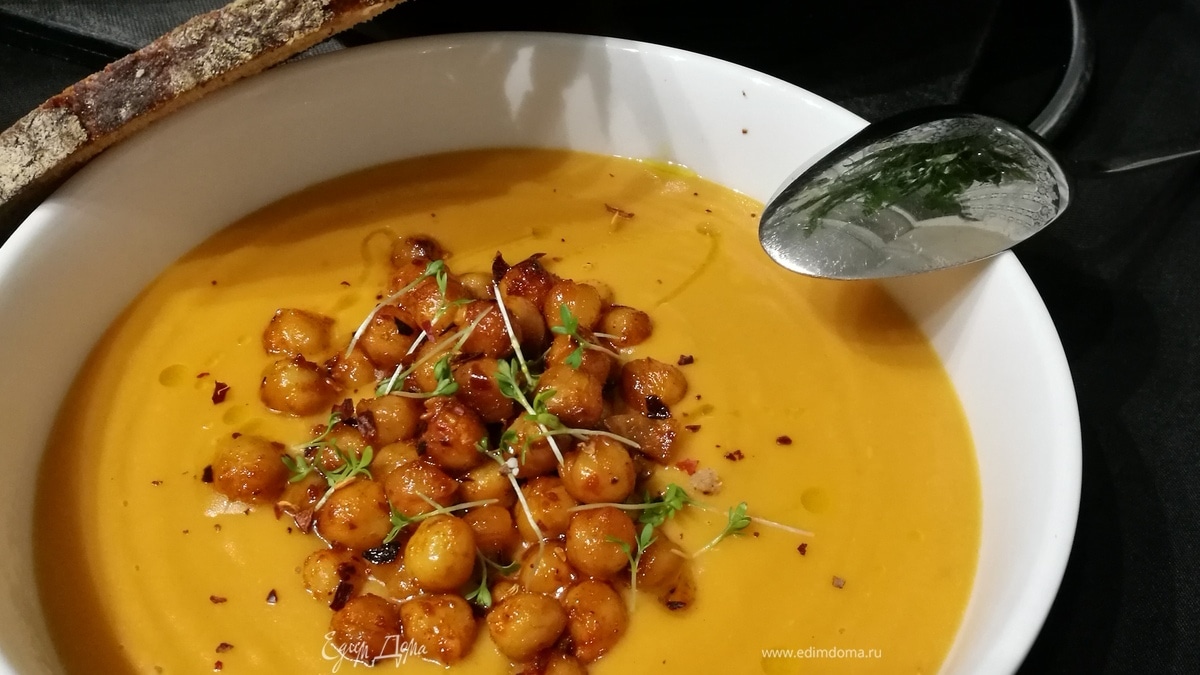 Спешу познакомить вас с тыквенным крем-супом с легкой азиатской ноткой. Необыкновенный аромат придают супу кунжутная паста и соевый соус. Суп готовится на основе воды или овощного бульона, поэтому он вполне диетический. Но особенный вкус придает супу запеченный нут. Любителям бобовых рекомендую обратить внимание на рецепт нута, он претендует на отдельное, самостоятельное блюдо!