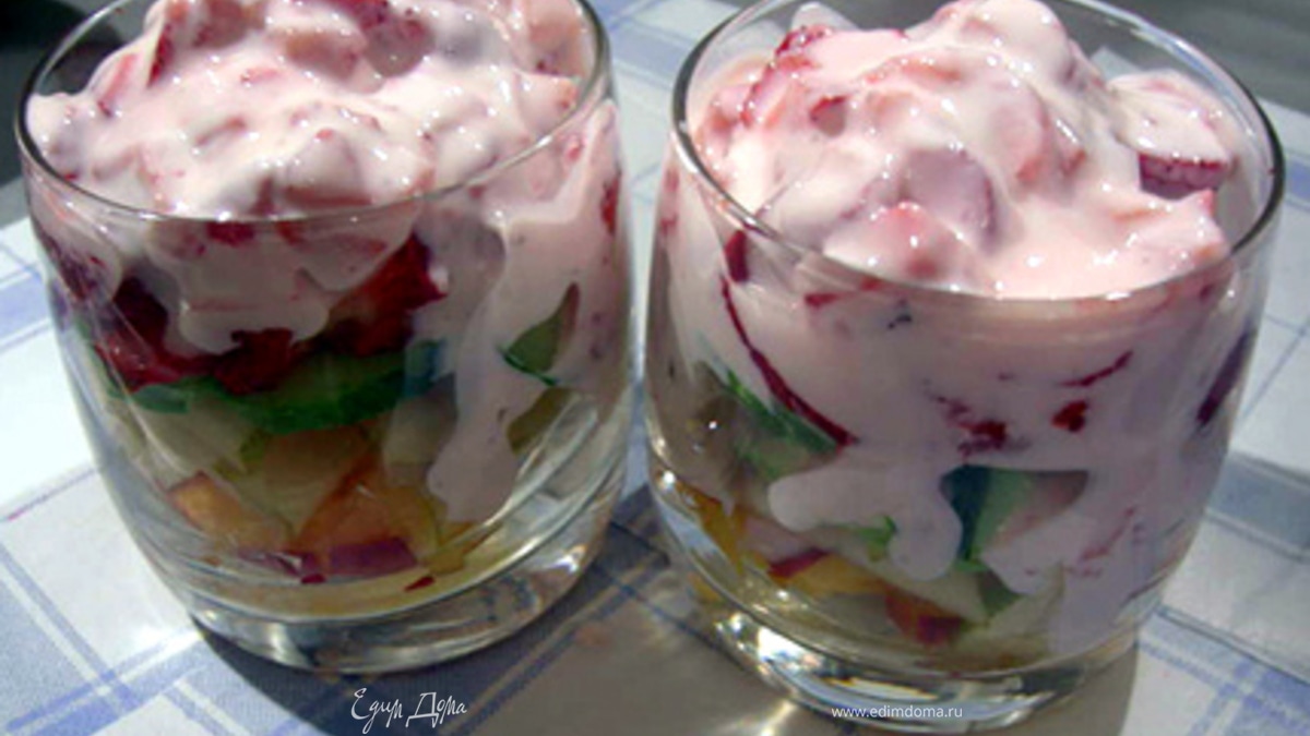 - Шаг 1Ингредиенты для салата тщательно вымоем. Клубнику нарежем половинками вдоль. Остальное нарезаем тонкими ломтиками. Пару клубничек растираем и смешиваем с йогуртом. Все ингредиенты выложим слоями в прозрачную посуду и заправим соусом из йогурта и клубники. Салат готов.