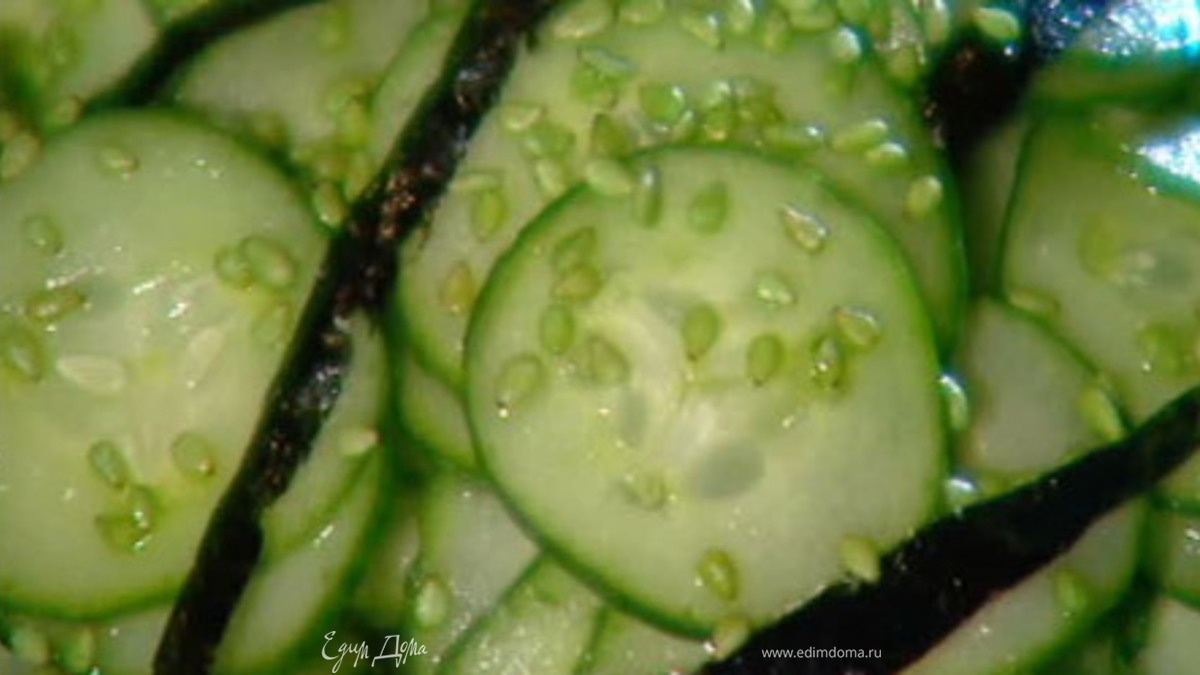 - Шаг 1Нарезаем тонко кольцами огурцы. Смешиваем ингредиенты на соус и в кастрюльке подогреваем до растворения сахара (но не кипятить) Остужаем и заливаем соусом огурцы. Ставим в холодильник до полного охлаждения салата.Затем сверху салата кладем семечки кунжута и мелко порезанную морскую капусту.