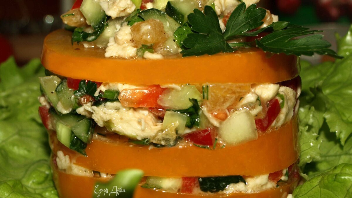 Салат для любителей хурмы. Салат для любителей интересных вкусов. Не обязательно салат подавать в виде милфея. Можно просто порвать листья салата, хурму