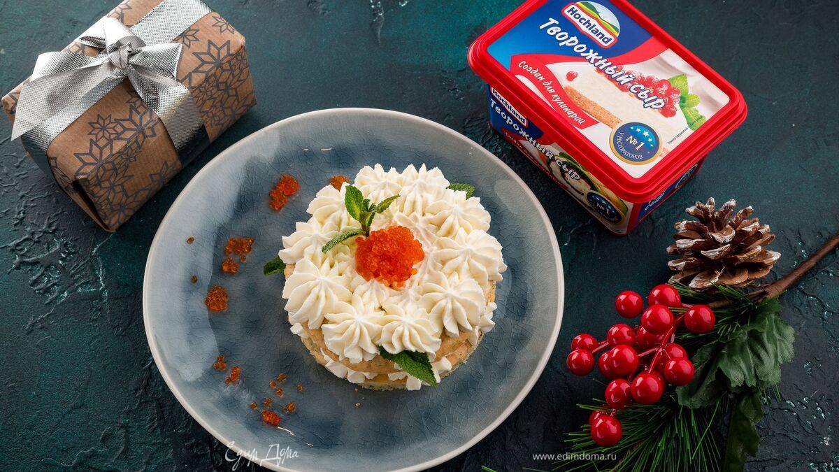 Для начинки взбейте творожный сыр Hochland «Для кулинарии» со сметаной.