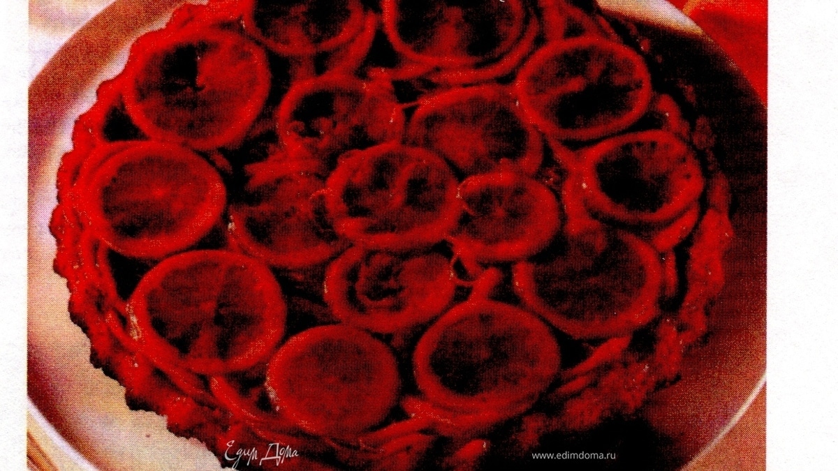 - Шаг 1Тесто: 1.просеять в миску муку, пудру и соль 2. влить масло 3. добавить яйцо и вымесить до однородной массы 4. скатать в шар, завернуть в пленку, положить в холодильник на час начинка: 1. растопить в кастрюльке масло и мед, добавить корицу 2. вылить смесь на дно формы диаметром 25см 3. нарезать апельсины поперек кружочками как можно тоньше, разложить в форме в несколько слоев раскатать тесто в пласт, перенести на скалке в форму и прижать края. Проделать 2-3 отверстия. выпекать: 25мин при 200 градусах, 1,75-2 часа при 160 градусах, пока тесто не станет коричневым.