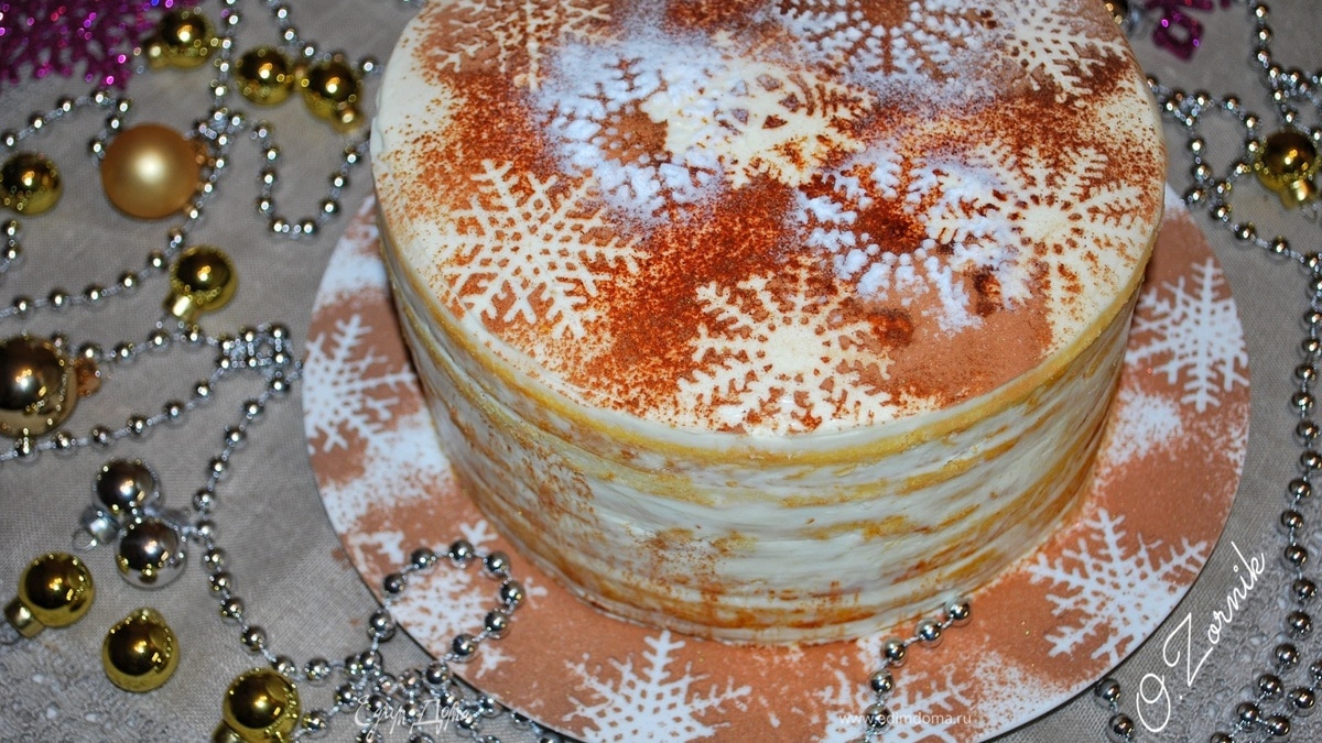 Украшаем по своему желанию. Я смешала какао и сахарную пудру и через трафарет «снежинки» посыпала торт. Даем торту пропитаться несколько часов. - Шаг 18
