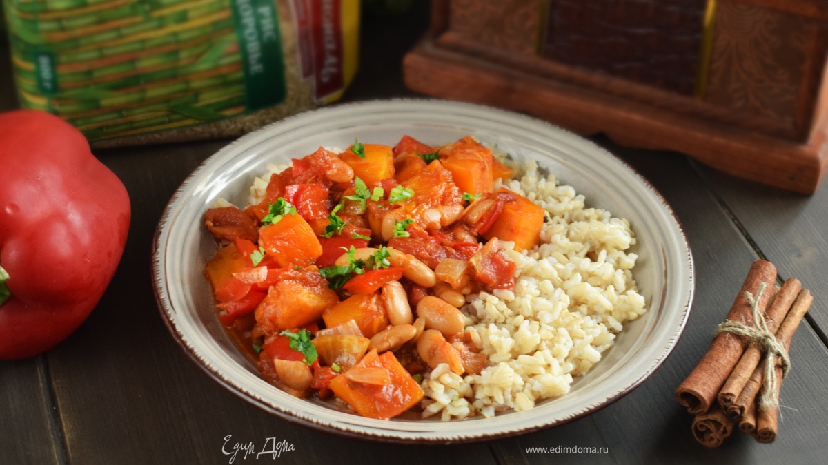 Пряное и сытное блюдо из овощей, бобовых и бурого риса. Если вы никогда не пробовали готовить блюда с копченой паприкой, настоятельно рекомендую отыскать эту приправу на прилавках супермаркетов. Это просто бесподобно! Блюдо постное.